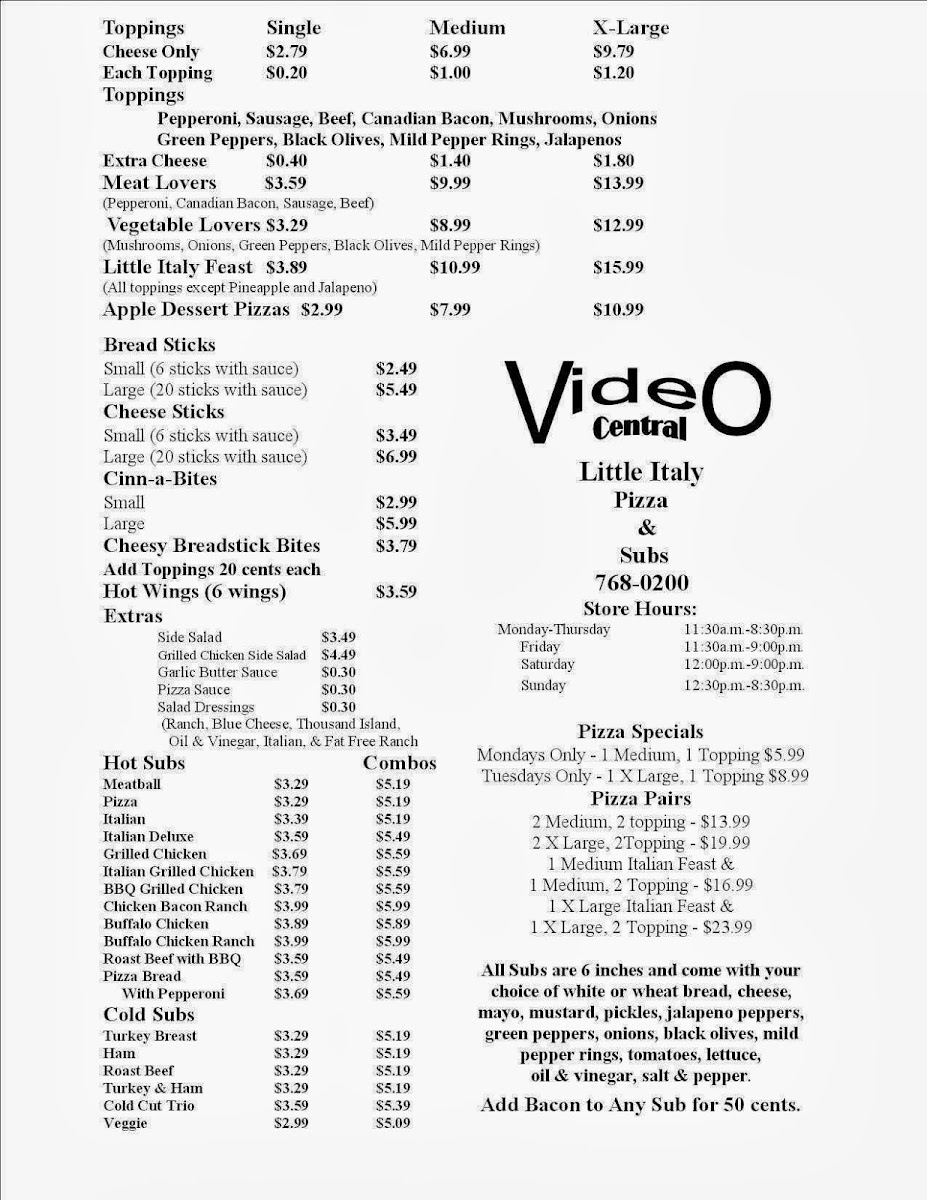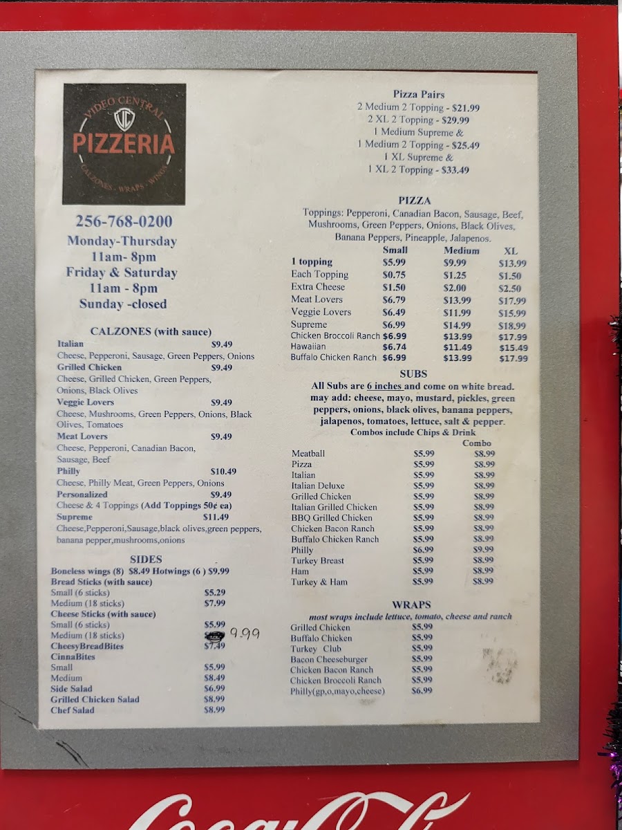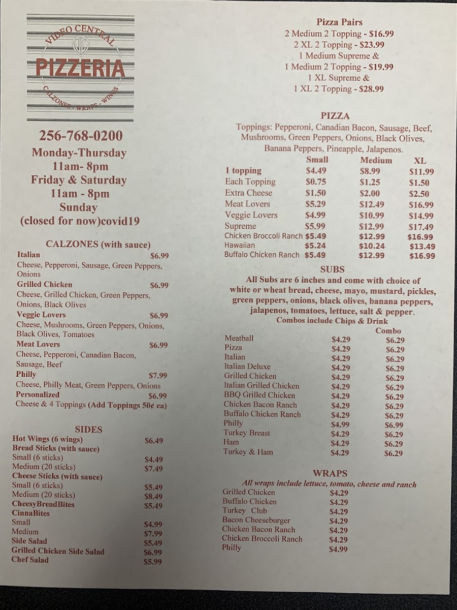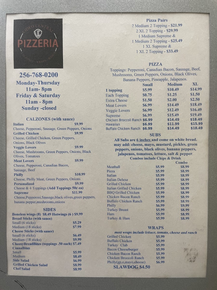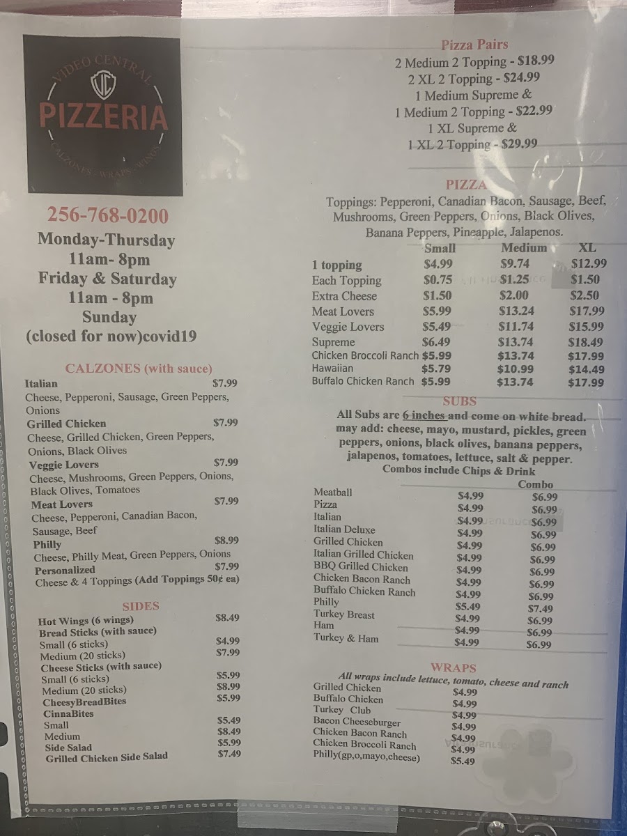 At Video Central Pizzeria Menu, located on AL-20 in Florence, you'll find a delightful selection of classic and unique pizzas to satisfy any craving. Whether you're in the mood for a traditional margherita, a bold BBQ chicken, or something a little more adventurous like a pesto spinach pizza, there's something for everyone. The menu also features a variety of appetizers, from crispy mozzarella sticks to savory garlic bread, perfect for sharing. Fresh ingredients and a passion for pizza-making shine through in every dish. Whether you're stopping in for a quick bite or enjoying a casual meal with friends, Video Central Pizzeria offers a cozy, welcoming atmosphere and a menu full of delicious options that will leave you coming back for more.